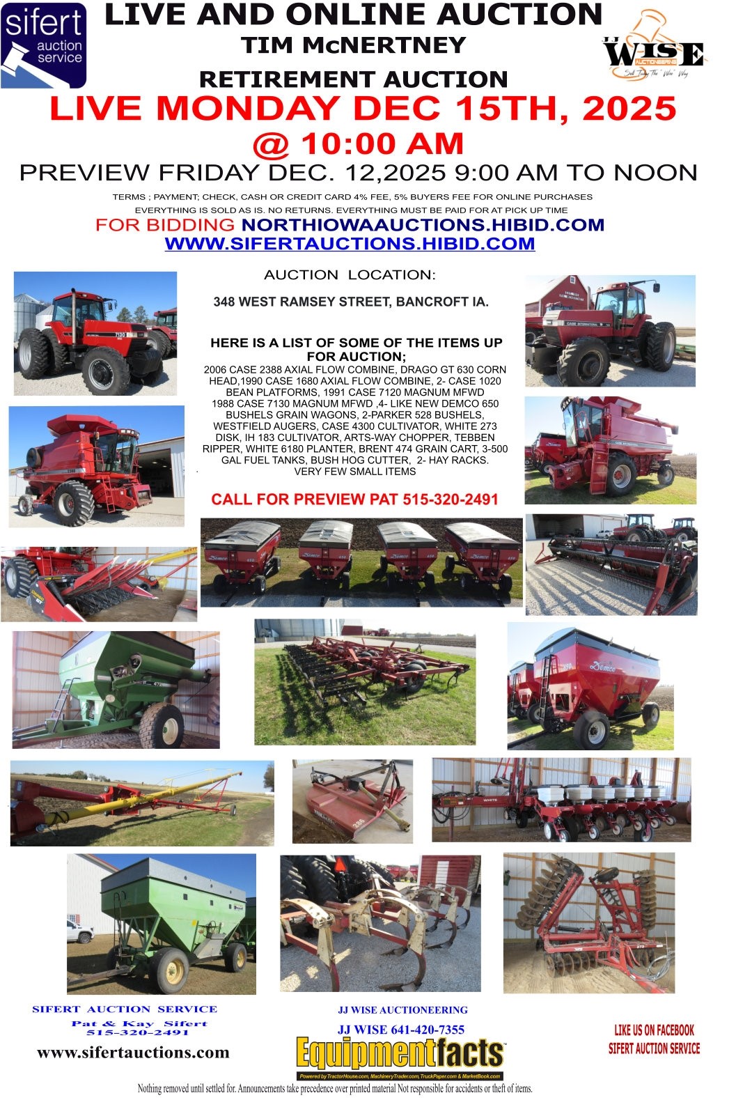 LIVE & ONLINE Auction in Bancroft, Iowa Dec 15, 2025 Tim McNertney Retirement Auction,